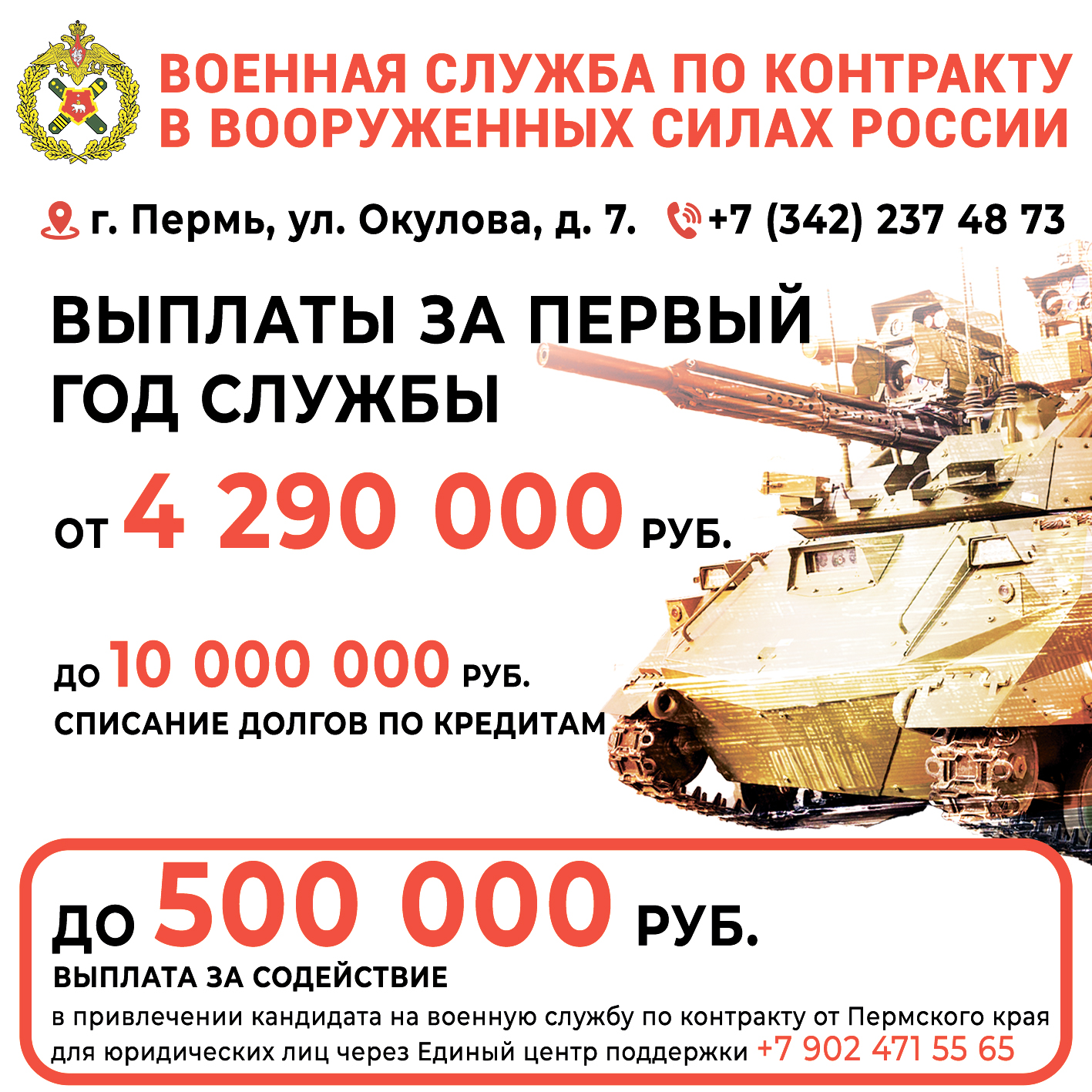 Информацию об условиях службы по контракту можно узнать в Пункте отбора на военную службу по контракту: г. Пермь, ул. Окулова, 7, тел. +7 (342) 237-48-73, а также в военкоматах по месту жительства.